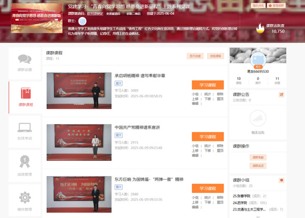 自赛事启动以来,我校易班发展中心紧扣党史学习教育核心要求,以易班优课平台为载体,精心打造并推出《中国共产党人精神谱系宣讲》《向“新”而行、行稳“质”远——以新质生产力引领青年成长》《勇攀高峰,传承通医先辈志;爱国奉献,弘扬科学精神魂》等体系化、校本化课程资源。为充分激发学生学习主动性,中心进一步优化课程设计,通过设置课群互动话题、优质学习资料、在线巩固作业等多维模块引导广大学生深化党史学习、赓续红色血脉。各学院积极响应赛事号召,广泛动员师生参与,通过“线上专题推送+线下实地宣讲”等双线模式进行活动预热和宣传,最终实现课程学习人次突破3.4万、课群活跃指数超1万的优异成绩,综合指数位列江苏省参赛高校第二名。