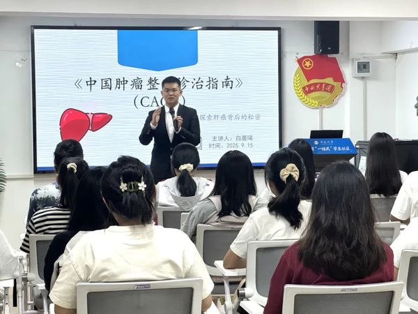 活动中,宣讲人白晨晞系统解读了CACA指南的核心内容和特色优势。该指南由中国抗癌协会组织3131位专家历时一年多编写完成,是我国首部肿瘤整合诊治指南。指南特别聚焦中国人群,纳入中国研究,注重中国特点,兼顾医疗可及性。通过精彩的短片展示和详实的数据分析,学生们深入了解了中国人群肝癌发病的流行病学特征、主要危险因素以及综合防治策略。
