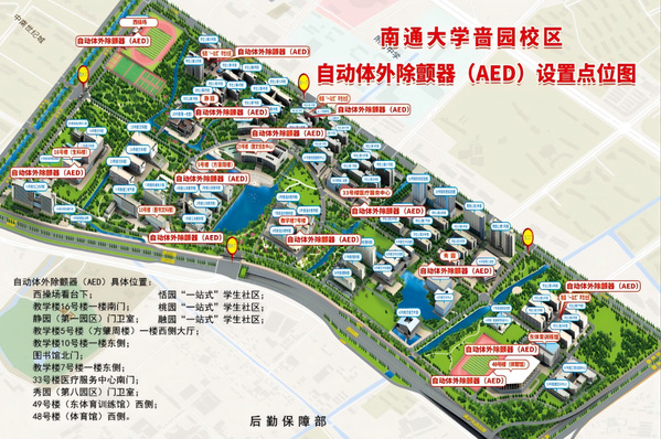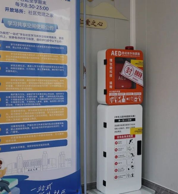 近日,南通市红十字会向我校捐赠的3台自动体外除颤器(以下简称AED)在恬园、桃园、融园三个“一站式”学生社区正式安装完成。该批设备的落地启用,是学校在南通市红十字会支持下系统推进急救教育试点学校建设、完善校园急救体系的重要实践,也标志着校园“200米急救安全圈”的设施基础得到进一步夯实。