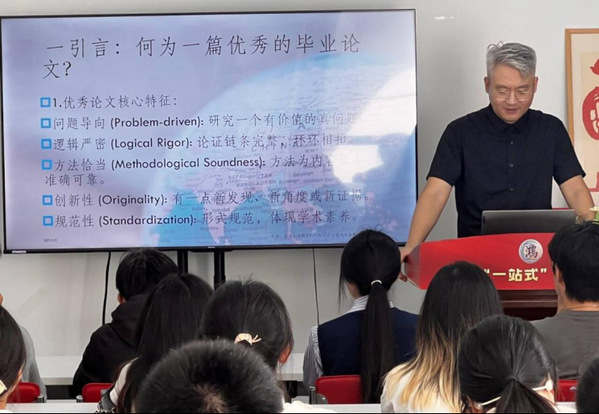 讲座伊始,孙攀老师以"毕业论文写作的注意事项"为主题,从商科专业特点出发,通过生动实例阐述了优秀毕业论文应当具备的五大特征:问题导向、逻辑严密、方法恰当、创新性和规范性。他强调,研究必须选择"一个有价值的真问题",并保持论证链条的完整性和严密性。 针对商科专业特色,孙老师详细演示了计量模型的选择与运用,强调"计量模型是商科论文的核心,也是目前无法被AI完全替代的部分"。在参考文献和格式规范方面,孙老师详细讲解了中英文文献的不同引用规范,对常见错误进行了逐一剖析,为同学们提供了切实可行的写作指导。他建议同学们遇到不确定的引用格式时,可采用序号标注法来避免格式错误。整场讲座内容充实、针对性强,既有理论高度又有实践指导意义。通过本次讲座,同学们对毕业论文写作有了更清晰的认识,对如何避免学术不端行为有了更深刻的理解,也为接下来的论文写作指明了方向。