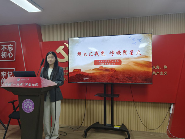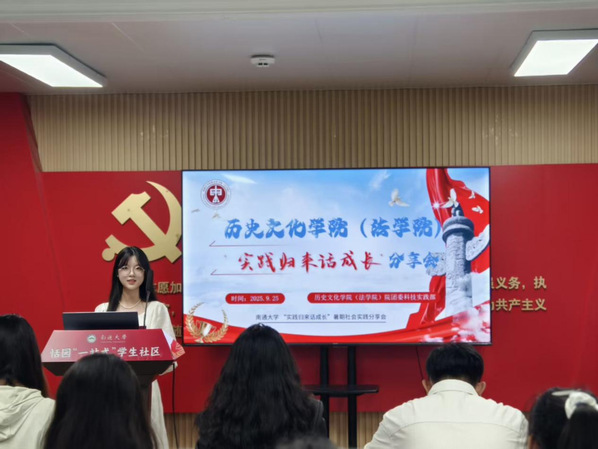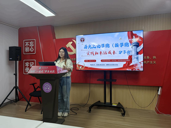 “问渠计划”南通大学支教队代表陈欣玥则分享了团队前往湖南宜章县梅田镇支教的难忘经历。面对艰苦的教学环境,队员们毫不退缩,全力以赴为当地孩子们传授知识。她的讲述让与会成员深刻感受到了支教队教学活动的艰难与不易,更让大家看到了他们无私奉献的精神和坚韧不拔的毅力。这无疑激励着学院更多学子立志投身伟大的教育事业,为社会的进步贡献自己的力量。 垄上助农队队员高梓墨则分享了团队暑期社会实践的精彩纪实。团队成员深入调研当地数字助农的创新模式,亲身参与农产品直播带货。通过短视频创作、直播带货及农事体验等多元形式,他们不仅深刻体会到了数字技术为乡村产业发展带来的翻天覆地的变革,更探索出了农产品销售与乡村文化传播双赢的崭新路径,为乡村振兴注入了蓬勃的青春动能。 “文物移动‘述’千年”实践团队员徐耀杨讲述了团队的暑假社会实践经历。该团队以“移动 +”的创新模式,将博物馆丰富的文化资源带进社区、学校与文博场馆,致力于破解文化资源分布不均、基层供给不足的难题。通过为广大群众提供基础文化知识服务,他们有力推动了中华优秀传统文化的创造性转化与创新性发展。 青春护航法援团队长杨雨婷则讲述了团队暑期社会实践活动的动人历程。她带领团队走进留守儿童学校,开展了一场别开生面的普法宣讲。实践团队从家庭教育、学校生活、社会实践等多个维度入手,让留守儿童更加直观地认识法律法规,促进他们树立尊法、知法、守法、用法的意识,为他们的健康成长筑牢了坚实防线。 红途探索小队队员柏睿分享了团队暑期社会实践的精彩瞬间。他们奔赴江苏省盐城市亭湖区新四军纪念馆, 开展以“寻迹红色博物馆,感悟伟大精神力”为主题的暑期社会实践活动。通过理论学习、实地宣讲、成果创作等形式,他们深入挖掘红色资源,传播红色精神,在实践中锤炼本领、坚定信念。团队表示将继续深化对党的创新理论的学习与研究,为实现中华民族伟大复兴的中国梦贡献青春力量。 江畔法声队队长佟慧蓝对团队的暑期社会实践进行了全面总结。他们团队奔赴美丽的长江边,运用所学知识开展普法宣传,讲述长江的重要性和保护长江的必要性。团队将总结本次实践经验,持续关注长江生态保护动态,进一步创新宣传形式、扩大宣传范围,同时呼吁更多社会力量参与长江大保护,共同守护长江的生态之美,为长江流域的可持续发展贡献更多力量。 律暖时光宣讲团队员祁苏则讲述了团队暑期社会实践的温暖故事。他们走进山东省烟台市牟平区仇家村,针对留守老人开展普法宣讲活动,重点讲解了老人们日常可能涉及的道路安全法。此次活动获得社会广泛好评,不仅让村民认识到了法律的重要性,也让志愿者深刻体会到了普法的意义,传承弘扬了“莫文隋”精神,增强了大学生的社会责任意识和奉献意识。 学院团委副书记马策老师进行了总结发言。他对各支小分队在暑期社会实践活动中取得的丰硕成果给予了充分肯定,并鼓励同学们在今后的学习生活中再接再厉,认真总结暑期社会实践活动中的宝贵经验,并将其灵活应用到学习生活中,做到融会贯通,促进自身全面发展。最后,他激励同学们在今后的社会实践活动中踊跃报名,积极展现自我风采,为大学生活增添绚丽色彩。 据悉,在2025年暑假,历史文化学院(法学院)紧密围绕红色文化传承、科技创新探索、乡村振兴助力、法治教育普及等关键领域,精心组建了十九支社会实践小分队。这些小分队开展的实践活动成效显著,得到了学习强国、中青网、中华网、中国网等众多权威媒体的关注,收获了数十篇国家级报道以及百余篇省市级报道,在社会各界引发了广泛而热烈的反响。此次“实践归来话成长”暑期社会实践分享会,全方位、多角度地展现了历史文化学院(法学院)学子积极进取、昂扬向上的精神风貌,以及他们心系社会、勇担使命的强烈社会责任感。相信在未来的日子里,历史文化学院(法学院)的学子们将继续秉持这份热忱与担当,在更广阔的社会舞台上书写属于他们的精彩篇章,为社会的发展贡献源源不断的智慧与力量。