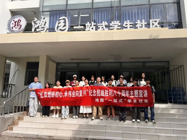 随后,参与活动的同学们在鸿园“一站式” 学生社区前合影留念。此次主题宣讲活动,不仅让同学们更加深入地了解了抗日战争的历史,缅怀了革命先烈的英勇事迹,更激发了大家的爱国热情与历史责任感。同学们纷纷表示,会铭记历史,传承抗战精神,在新时代的征程中,以更加昂扬的姿态,为实现中华民族的伟大复兴而努力奋斗。