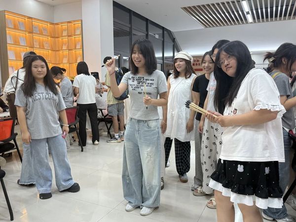 简易搭建的投壶区域前早早围满了跃跃欲试的同学。工作人员提前准备 好细长箭矢与古朴投壶,同学们瞄准箭矢、屏气投掷,在传统游戏里感受古人过节的趣味。有的同学屏气凝神,手腕轻扬,箭矢“嗒”地精准入壶,周围立刻响起欢呼声;有的虽初次尝试,箭矢擦壶而过,却也笑着接过同伴递来的箭,再次挑战。