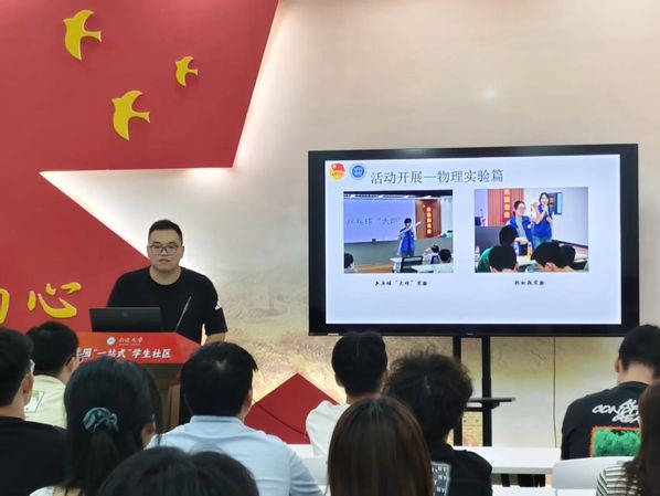“格物致知”科普实验志愿服务团负责人、研24物理学陈俊强同学分享了走进南通市狼山街道园林社区开展实践活动的点滴,他们以“探索科学奥秘,点亮梦想之光”为主题,用一个个妙趣横生的实验,为青少年打开科学殿堂的大门。