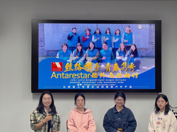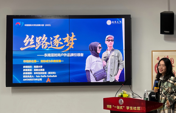 本次分享会特邀在2025年中国国际大学生创新大赛中斩获国赛金奖的“丝路逐梦”团队进行分享。该项目是我校印尼留学生Faiz与中国同学携手创业的典范,团队敏锐洞察市场,依托中国智造与供应链优势,通过融合中印尼文化的设计、创新面料与AI营销,成功打造出印尼电商户外第一品牌,是青年学子投身“一带一路”实践的生动写照。分享会上,团队代表张佳雯首先进行了精彩的项目展示。