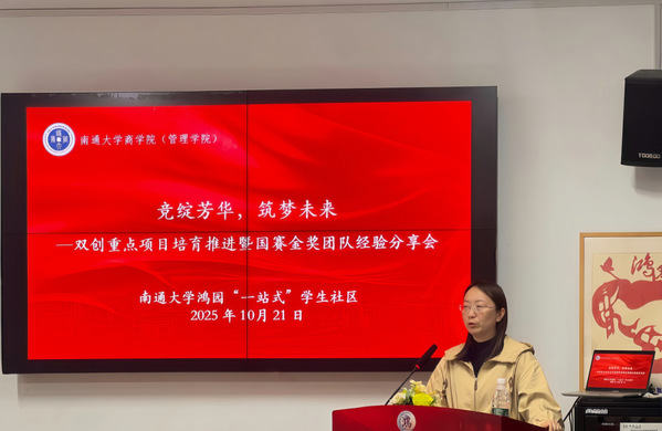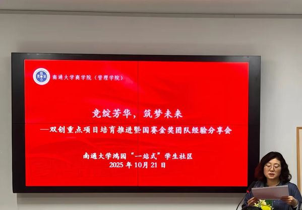 为营造浓厚学科竞赛氛围,激发学生创新创业热情,2025年10月21日下午,南通大学商学院(管理学院)在鸿园“一站式”学生社区党建之家成功举办“竞绽芳华,筑梦未来——双创重点项目培育推进暨国赛金奖团队经验分享会”。南通大学商学院(管理学院)党委副书记、副院长葛慧敏,团委书记王艳,学工办副主任范辰晨出席本次活动,学院各重点项目团队成员共同参加了本次分享会,活动由2022级辅导员顾金玺主持。