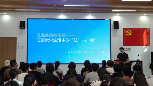 为了深入学习贯彻习近平法治思想,切实提高校园法治宣传教育的实际效果,同时落实教育部和省教育厅关于开展法治宣传教育周活动的相关安排,10 月 17 日下午,体育科学学院与外国语学院共同举办了法治宣传教育周主题活动。此次活动特别邀请了南通市崇川区人民法院的任磊法官,为师生们带来了一场法治专题讲座。活动由外国语学院党委副书记、副院长王媛媛主持。