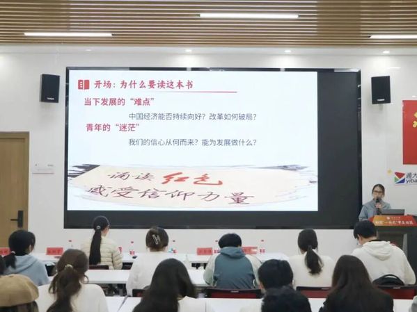 主持人徐逸凡首先阐述了活动背景与目标,《强信心,促发展,理论热点面对面》此书作为解读经济复苏、科技创新等热点的权威读物,既是把握国家大势的“工具书”,也是提升理论素养的“必修课”。在师生共读环节,与会师生围绕书中内容展开了深入交流与讨论。