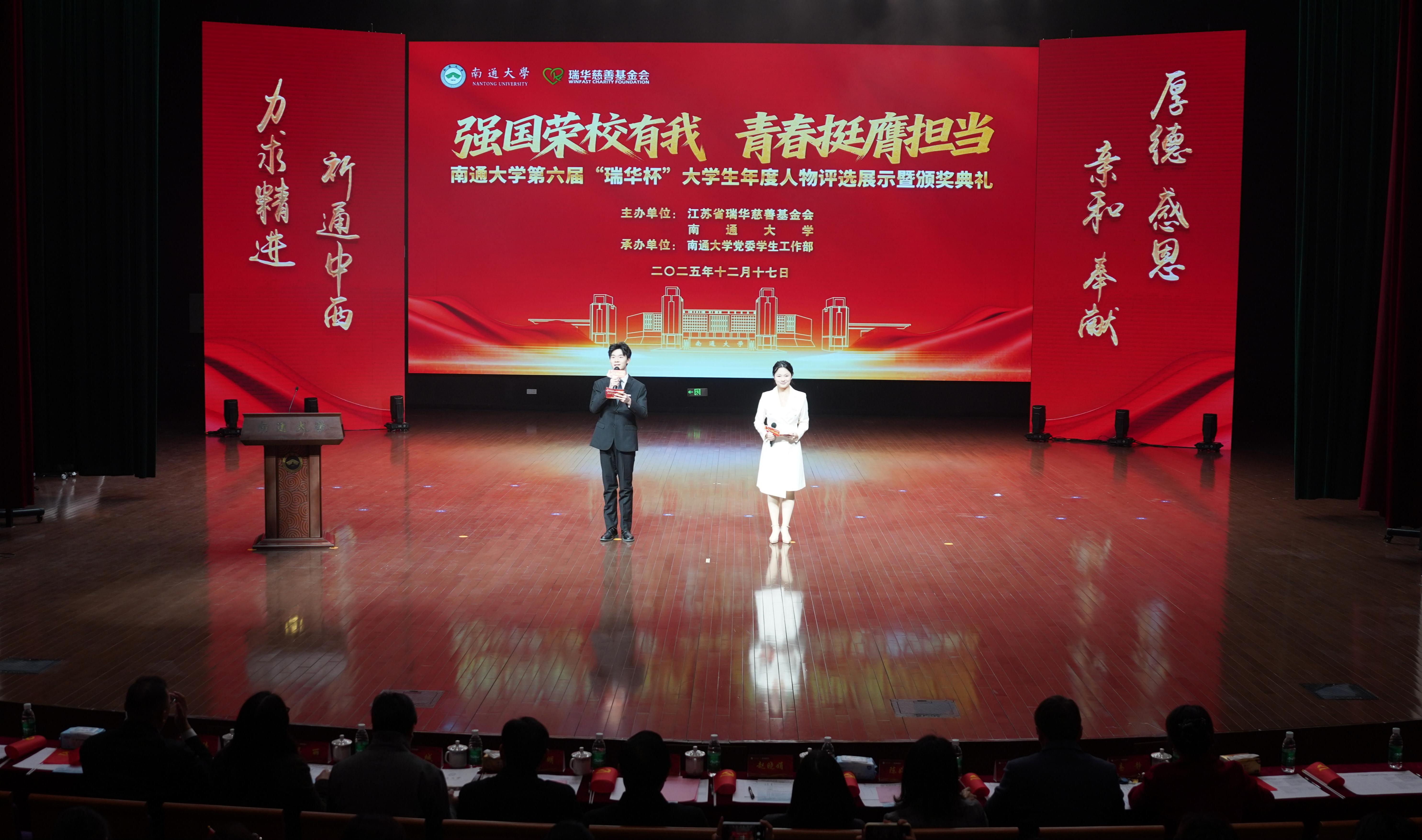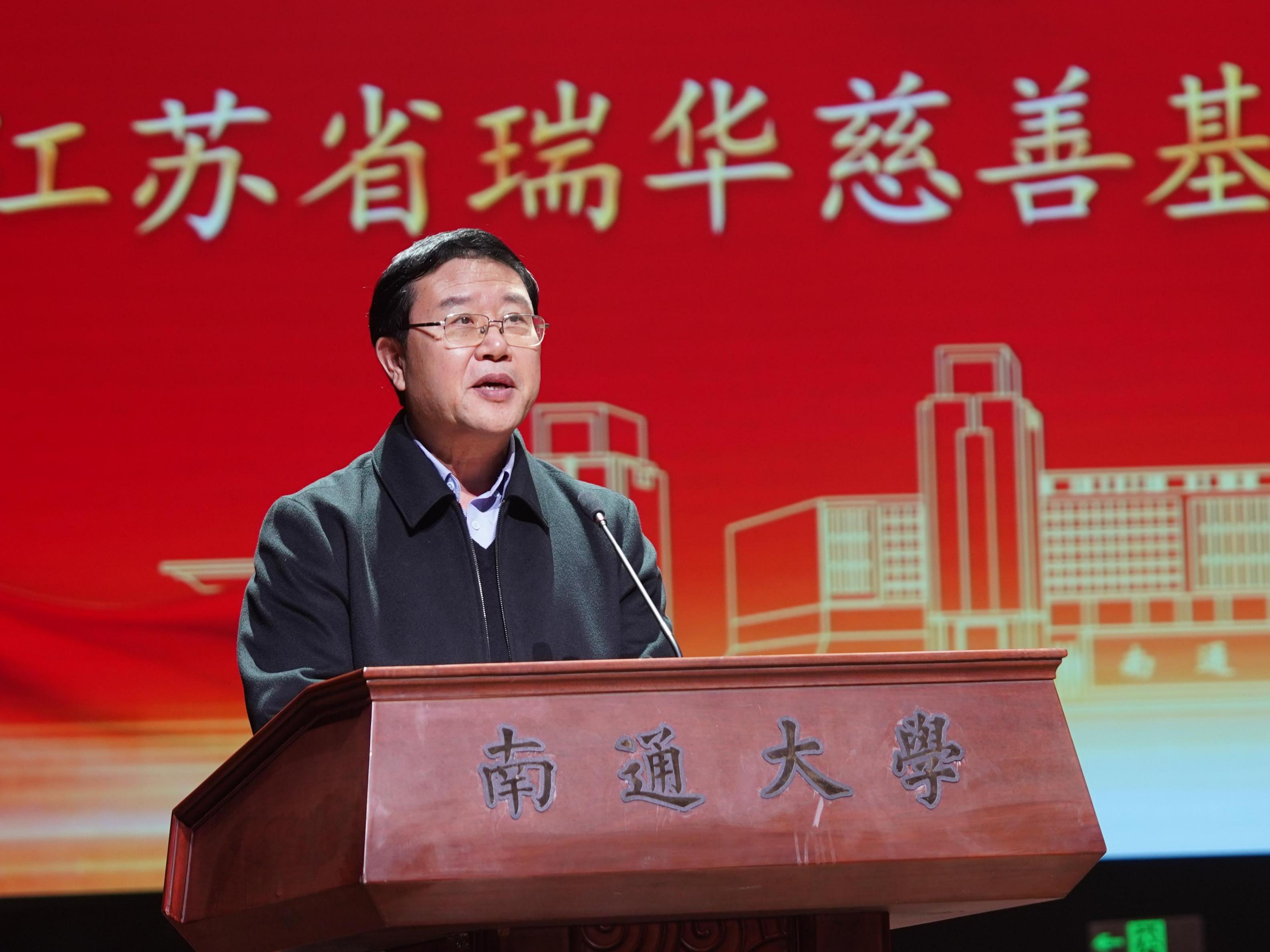 吉明明代表学校向江苏省瑞华慈善基金会长期以来对学校发展的鼎力支持表示衷心感谢。他指出,南通大学百余年来秉持“祈通中西,力求精进”的校训精神,培育了一代又一代心怀家国、脚踏实地的青年才俊。自2020年学校与基金会正式建立战略合作、成为基金会在宁外首家全面合作高校以来,双方携手走过六载春秋,先后开展“瑞华春雨助学金”“瑞华启梦助学金”等多个项目。如今,“瑞华杯”已从单纯的合作项目成长为极具影响力的育人品牌,成为慈善与教育深度融合的生动范例。他希望全体同学以获奖学子为榜样,把个人理想融入国家战略和地方发展,成为慈善精神的传承者、践行者,在青春的赛道上奋力奔跑,书写无愧于时代、无愧于韶华的精彩篇章。