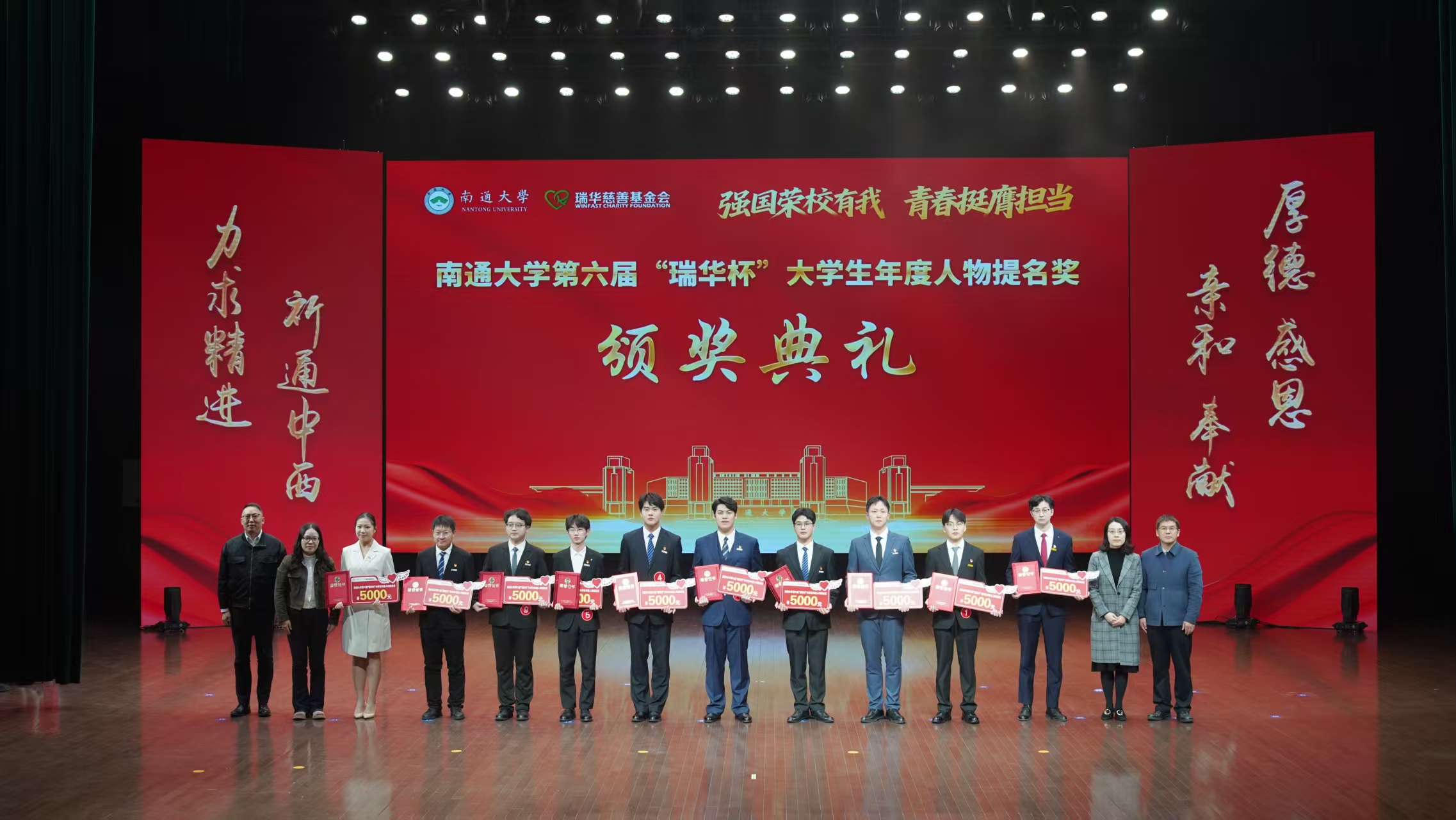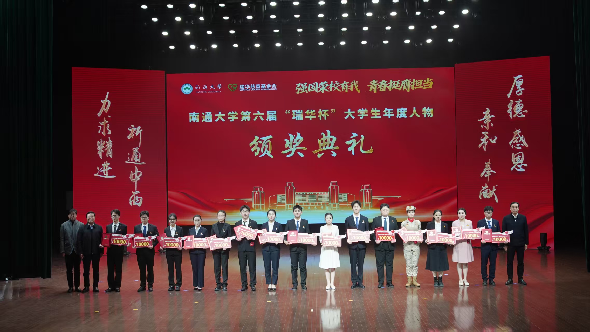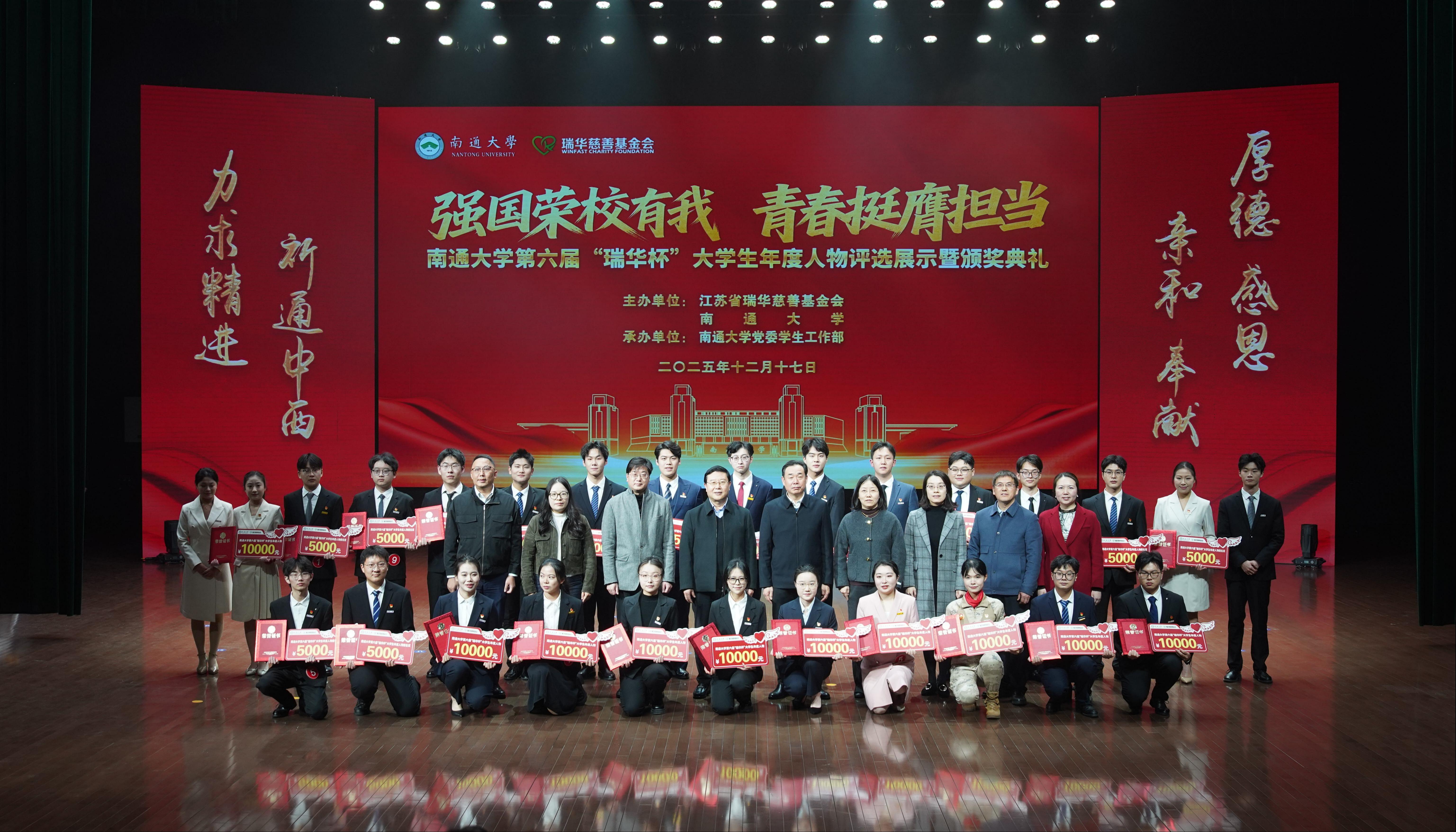 史兆荣向获奖学生表示热烈祝贺,分享了江苏省瑞华慈善基金会“厚德、感恩、亲和、奉献”的核心价值理念。作为省内原始基金规模领先的非公募慈善组织,基金会自2017年成立以来,在助学、助医、助孤、赈灾、乡村振兴五大领域深耕不辍,先后荣获“中华慈善奖”“全国先进社会组织”等荣誉。他表示,与南通大学的合作是基金会践行慈善精神、助力教育发展的重要实践,“瑞华杯”以“诚信励志、社会实践、学术科研、创新创业”为导向,让优秀学子的奋斗故事成为校园里最鲜活的思政教材。他希望获奖同学将荣誉沉淀为前行底气,既做追求卓越的奋进者,也做心怀家国的实干家,同时期待更多通大青年以榜样为炬,让奋斗成为青春最鲜明的注脚。