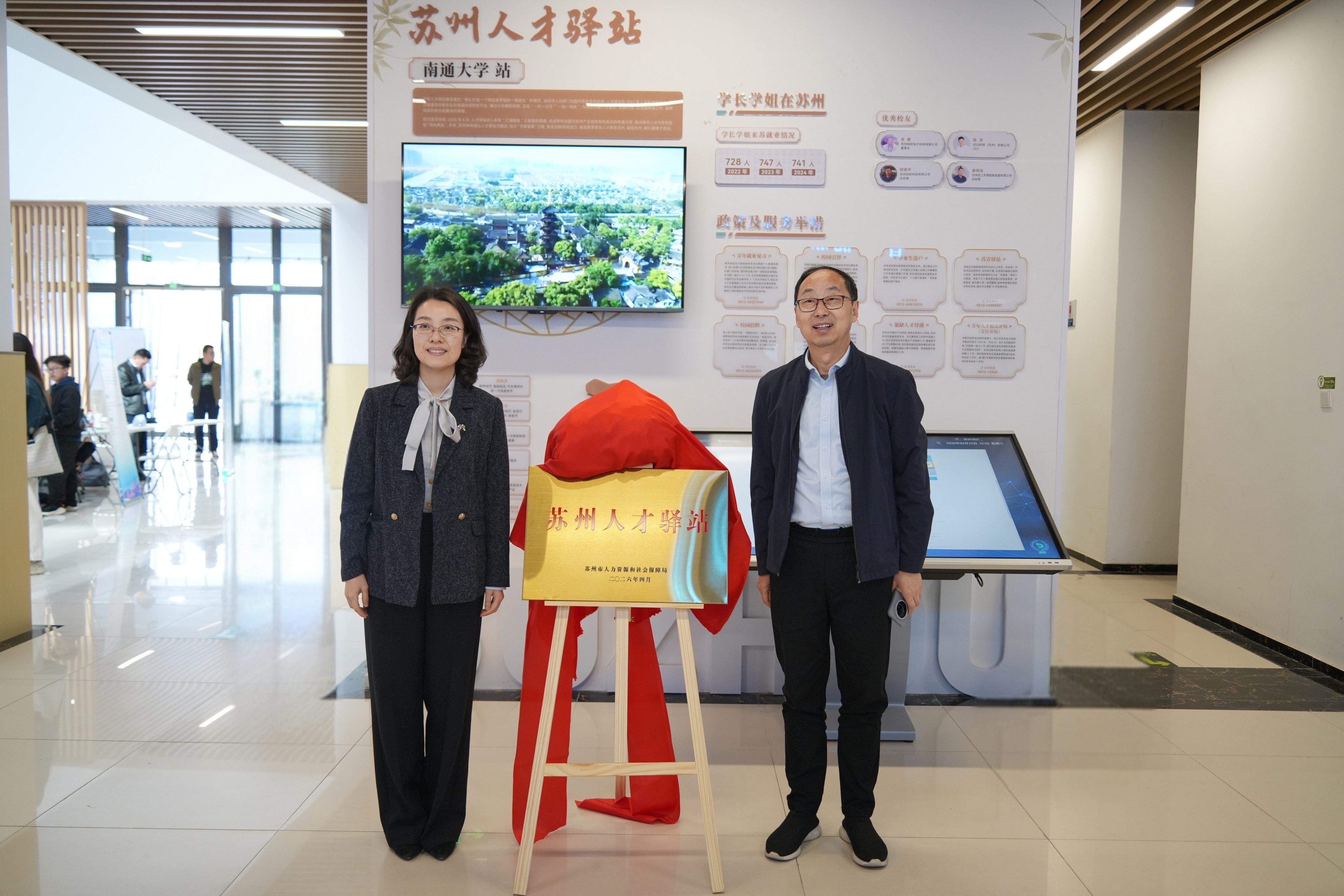 揭牌仪式上,苏州人才服务中心主任李健与南通大学学生工作处处长陈婷婷共同为“苏州人才驿站”揭牌。驿站设于啬园校区41号楼一楼学生职业生涯发展中心,是苏州人才服务中心与南通大学深化落实此前签订的人才合作协议的重要成果。驿站的建成投用帮助学生不出校门就能常态化了解苏州、对接岗位,进一步打通了校地协同育人、送岗到校的“最后一公里”,为学生提供了日常化、近距离的就业服务。